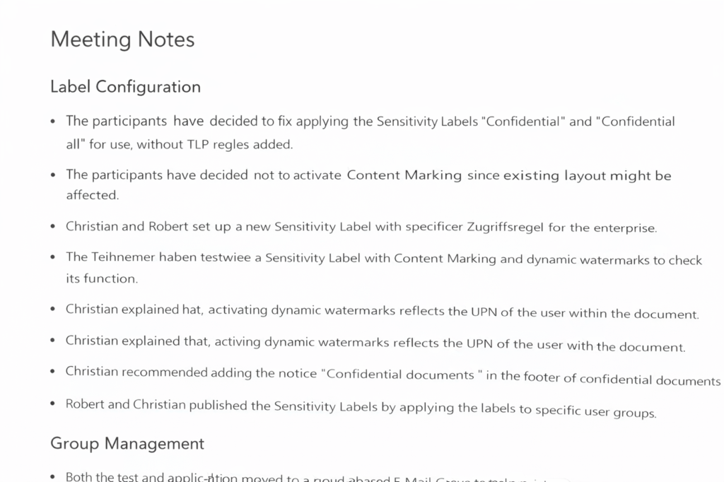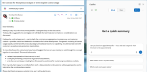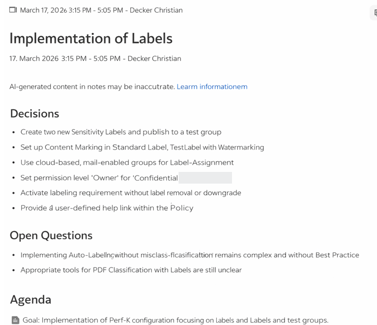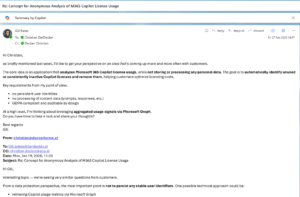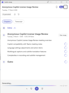 Meeting-Zusammenfassung geht auch ohne Microsoft 365 Copilot Lizenz. Einfach das Transcript runterladen und dem Microsoft 365 Copilot Chat geben und um eine Meeting Zusammenfassung bitten – funkt großartig.