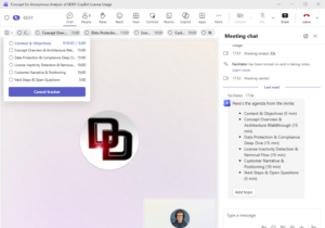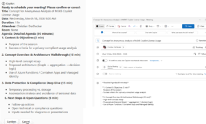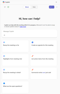 Zusätzlich könnte ich natürlich auch den Copilot nutzen – etwas was ich ehrlich gesagt fast nie nutze, weil ich hierfür noch wenig Use-Cases gefunden habe. Einen Use-Case, den ich gehört habe, hab ich nett gefunden: Wenn Du in einem größeren Meeting ev. nicht immer ganz aufmerksam warst, frag den Copilot gegen Ende: „Welche Frage sollte ich den Vortragenden fragen“ – dann wirkt es als wärst Du interessiert und aufmerksam 😉