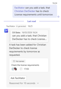 Weiters kann ich mit dem Facilitator chatten (@Facilitator) und ihn zb bitten eine Aufgabe zu notieren (meistens erkennt er Aufgaben von selber)